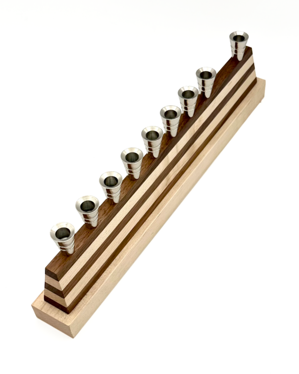 The Linea Menorah by sculptor Edward Inks brings together warm wood, clean geometry, and a quiet, modern presence. Built from alternating walnut and maple, the Linea Menorah features a striped trapezoidal base that feels both architectural and grounded. Its long, linear silhouette is defined by a row of nickel-plated candle cups that sit in perfect alignment along the top edge.