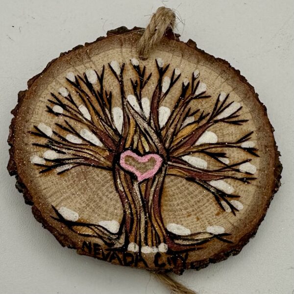 Made from upcycled oak branches from our Nevada City property, this one‑of‑a‑kind ornament features a hand‑burned and hand‑painted oak tree with a heart at its center. Each piece is crafted with care and can be personalized to make it truly yours. Use it as a meaningful holiday ornament or a reusable gift tag that adds warmth and authenticity to any celebration.